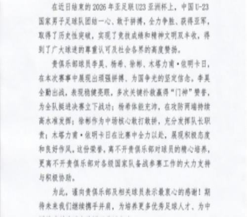 李昊、杨希等在U23亚洲杯表现出色,足协致谢青岛西海岸