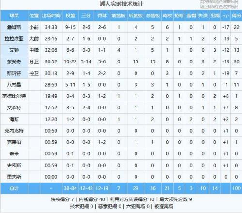 湖人:东契奇30分15板8助、詹姆斯22分5板6助、艾顿13分5板1助、八村塁11分3板1助、文森特8分1板、斯玛特7分3助、拉拉维亚5分2板2助、海斯2分2板2帽