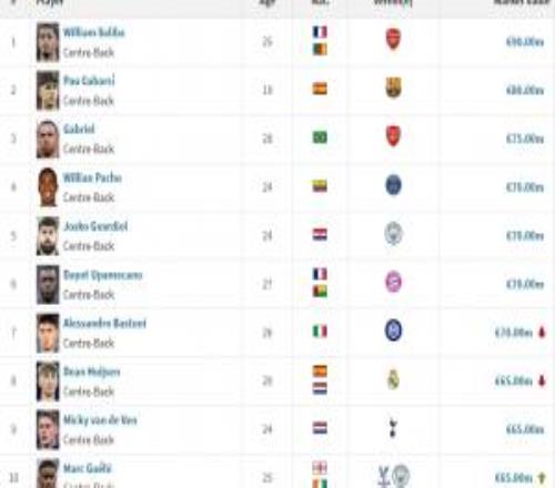 全球中卫身价排名:昔日第一巴斯托尼跌第四,萨利巴9000万世一卫