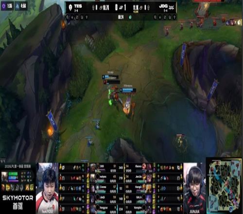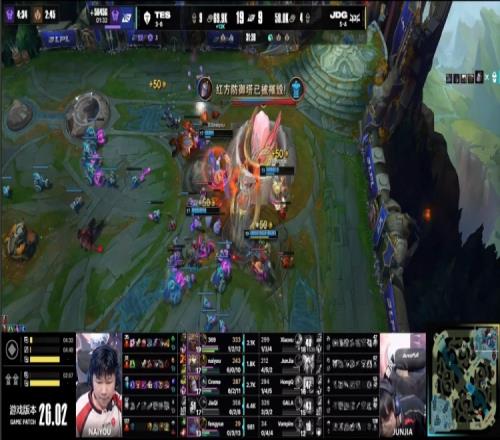 中期,Vampire牛头与HongQ沙皇下路越塔击杀Creme发条,JDG领先2k,TES随后放出先锋撞掉中路一塔,但仍落后1.5k。