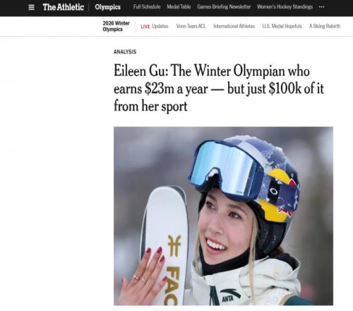 体育播报02月06日宣 米兰科尔蒂纳冬奥会拉开帷幕,The Athletic撰文解析了滑雪选手古爱凌,将她在2025年的收入做了分析,并在女子运动员领域做了对比。文章内容如下。