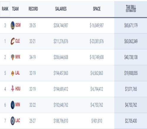 在需要缴奢侈税的7队中,勇士6567万力压骑士6306万继续霸占榜首,尼克斯4074万奢侈税,湖人、火箭、森林狼、快船的奢侈税则分别是:1991万、707万、475万和271万。