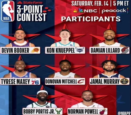 卫冕冠军德文-布克和两届赛事冠军利拉德都将参加今年的三分大赛,另外还有马克西、米切尔、克努佩尔、穆雷、波蒂斯和鲍威尔参加。