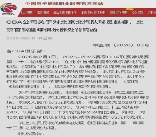 CBA官方宣布:由于赵睿发表严重不当言论,禁赛三场以及罚款五万......