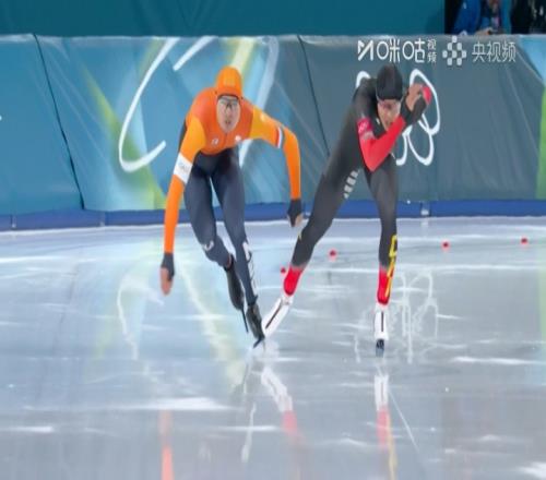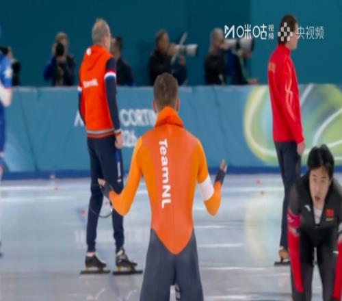 体育播报02月12日宣 米兰冬奥会速度滑冰男子1000米决赛,廉子文与荷兰选手约普·文内马斯在换道区冰刀碰撞,廉...
