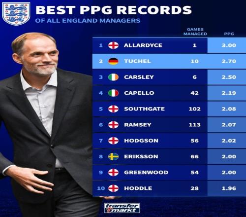体育播报2月12日宣 图赫尔正式与英格兰队续约至2028年,德转也盘点了英格兰队史场均积分最高主帅榜单,具体如下: