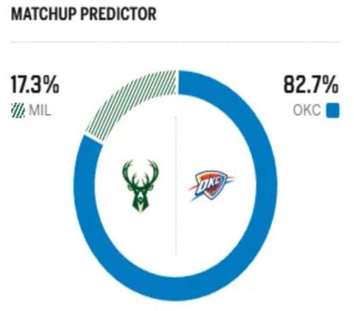 赛前,美媒ESPN对本场比赛进行了胜率预测,雄鹿队胜率仅有17.3% ,雷霆胜率则高达82.7% ,差距非常明显。