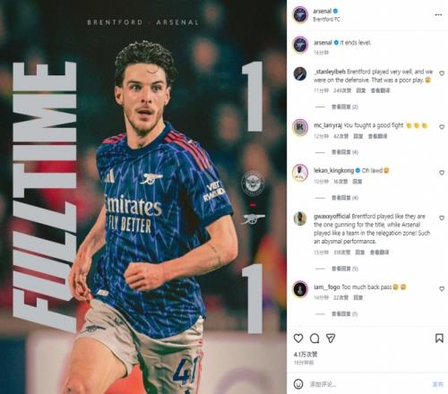 赛后,阿森纳官方社媒发出战报图仅16分钟后,球迷评论就来到了上万条。