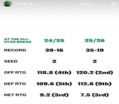 布朗晒出上赛季和本赛季凯尔特人在全明星假期时的战绩和各项数据对比。