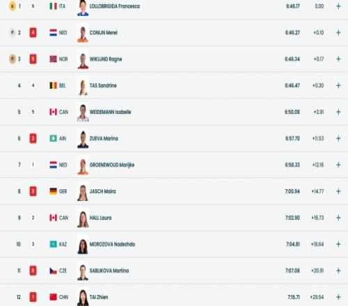 洛洛布里吉达以6分46秒17的成绩夺冠,此前她还破奥运纪录获得速度滑冰女子3000米项目金牌。荷兰选手梅雷尔·科尼扬6分46秒27获得亚军,挪威选手朗妮·维克隆德6分46秒34夺得铜牌。