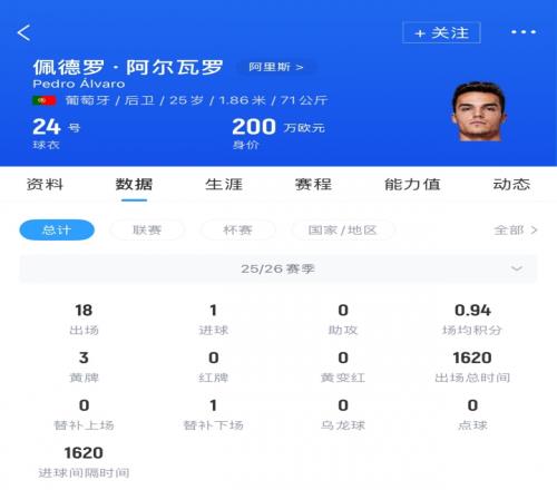 佩德罗·阿尔瓦罗现年25岁,德转身价200万欧,去年夏天加盟希腊超球队阿里斯,德转显示他与阿里斯已于2月12日解约。佩德罗·阿尔瓦罗效力阿里斯半赛季出战18场收获1球。