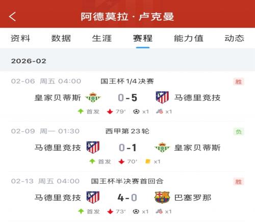 冬窗28岁的卢克曼以3500万欧加盟马竞后,3场比赛全部首发,国王杯连续传射,三战一共收获2球2助攻。
