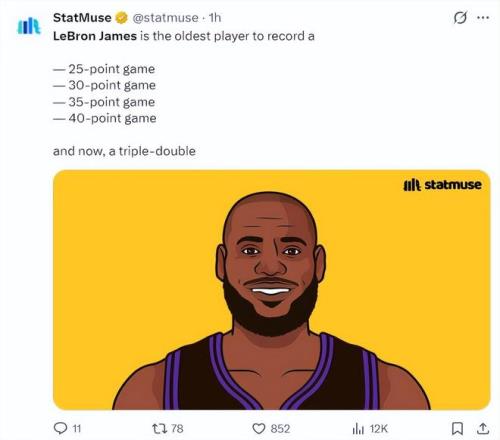 数据媒体Statmuse写道:詹姆斯从最年长单场25+、单场30+、单场35+、单场40+到单场三双。勒布朗-詹姆斯自最年轻的纪录到最年长纪录都统治了一个遍。