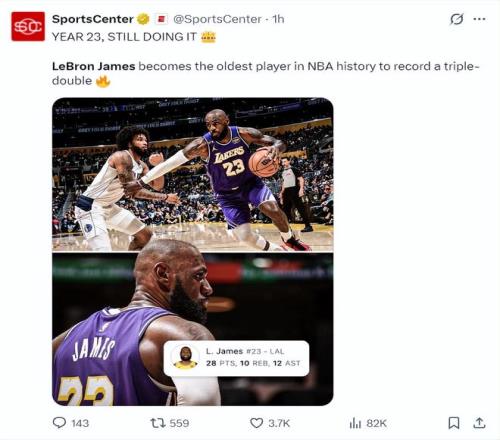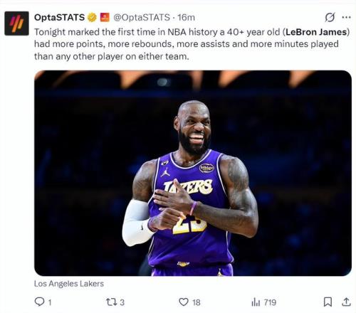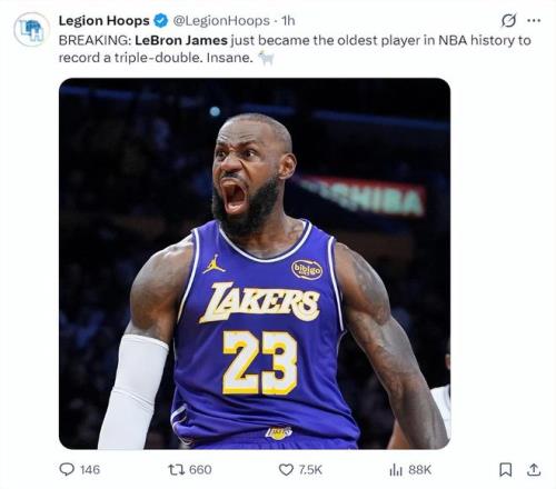 美媒LH写道勒布朗成为历史最年长的三双球员,GOAT。