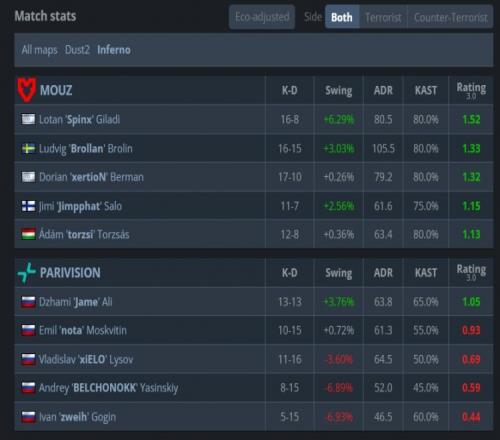图二MOUZ选图炼狱小镇先作CT,手枪局PV全员冲A1遭torzsi三杀送出首分,次回合PV纯E让出第2分。来到长枪回合,PV抢下香蕉道打掉xertion与Brollan后下包拿到首分,但MOUZ两回合回防B点得手连拿2分。第6回合Jame英雄大狙开场双杀,MOUZ成功3v5拿到第5分。次回合PV打香蕉道失利,zweih战绩一路来到0-7。第9回合zweih终于开张,但PV连续冲香蕉道失败,MOUZ将比分扩大至8-2。最终MOUZ以10-2结束上半场。