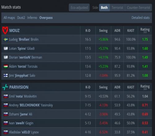 图三死亡游乐园PV先攻,MOUZ拿下手枪局后连拿2分,来到长枪回合,torzsi开场掉线,小吉米与Brollan双人四杀守住B点拿到第3分,比赛进入技术暂停。技术暂停回来,PV纯E冲A下包,上帝拿到torzsi大狙后双杀拿到首分。torzsi次回合大狙双杀找回场子拿到第4分,但PV又手枪翻盘,nota一把tec-9打掉torzsi再送Jame大狙,但Brollan与xertion发力让MOUZ拿到第6分。随后PV被锁3分,MOUZ以9-3结束上半场。