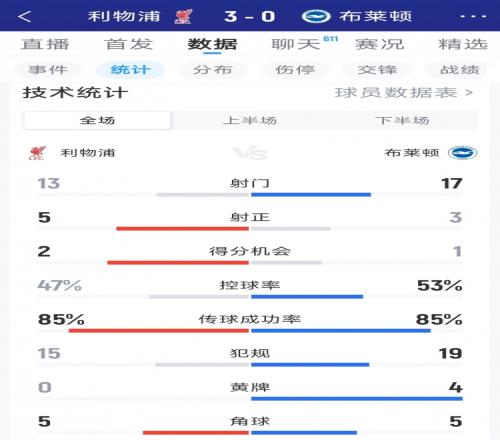 体育播报2月15日宣 在本轮足总杯,利物浦3-0击败布莱顿,以下为双方全场数据对比: