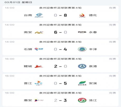 体育播报03月01日宣 泉州市首届“迎春杯”足球联赛今天结束6场比赛的争夺,德化、南安、丰泽、安溪均获得大胜,鲤城、洛江赢球,本文为大家带来每场比赛的进球动图和积分榜情况。