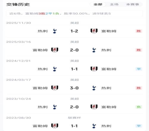 目前英超积分榜上,富勒姆11胜4平12负积37分,位列第10;热刺7胜8平12负积29分,位列第16。双方赛季首次交锋中,热刺主场1-2不敌富勒姆。