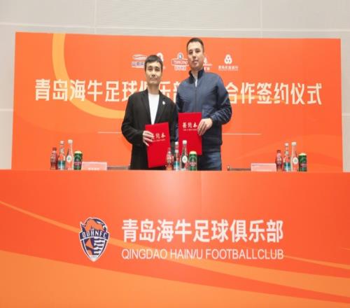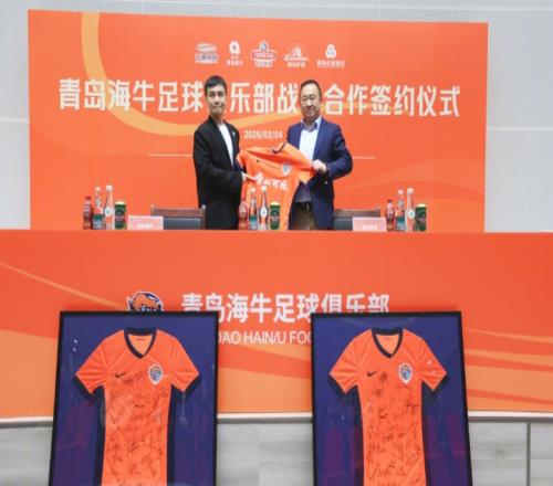 3月4日,青岛海牛足球俱乐部2026赛季出征仪式在城阳区青春足球场圆满举行。2026赛季,青岛海牛足球俱乐部将携手青岛本土品牌青岛啤酒、青岛饮料集团、青岛银行、青岛农商银行一同为这座城市的荣誉而战,出征仪式中,俱乐部与该4大品牌进行了签约仪式,携手向前。活动期间,新赛季球衣由部分球员展示,胸前广告“崂山可乐”首次亮相。
