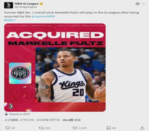 北京时间3月7日上午,NBA发展联盟官宣:多伦多猛龙下属的猛龙905队,签约前NBA状元秀马克尔-富尔茨。本赛季富尔茨将征战发展联盟,并寻求机会重返NBA。2024-25赛季,富尔茨曾在国王队效力,本赛季一直是自由球员。