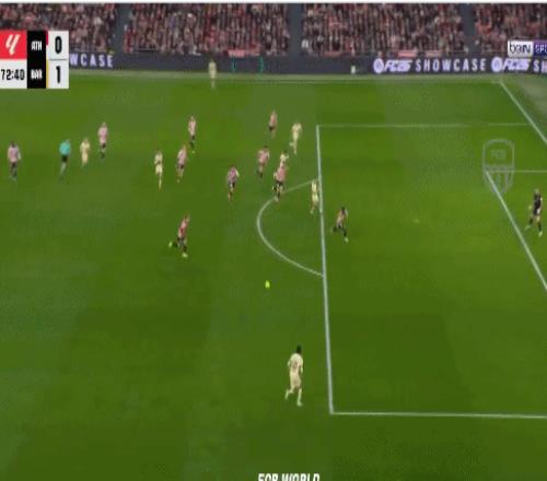 佩德里左路带球摆脱防守,随即大范围斜向传球找到亚马尔。禁区右侧,亚马尔面对毕尔巴鄂竞技后卫博伊罗的防守。亚马尔利用节奏、步频的变化,在控球中调整。博伊罗滑倒,亚马尔左脚精彩兜射打死角!