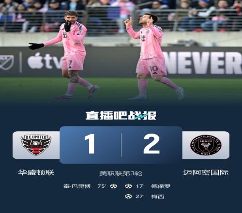 全场比赛结束,最终迈阿密国际2-1华盛顿联。