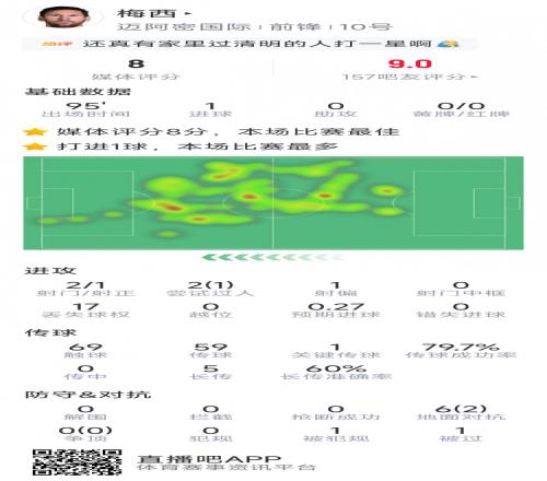 体育播报3月8日宣 在本轮美职联,迈阿密国际2-1击败华盛顿联,以下为梅西全场数据: