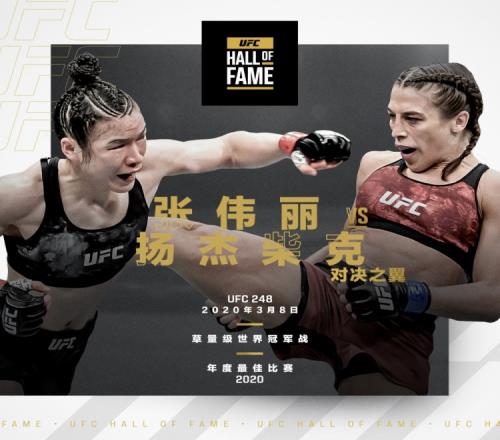 体育播报3月8日宣 UFC官宣,张伟丽vs乔安娜(UFC 248)入选2026年UFC名人堂“对决之翼”,成为UFC历史上首场入选名人堂的女子比赛。