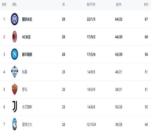 在积分榜上,国际米兰依然占据榜首位置。国际米兰22胜1平5负,拿到67分。AC米兰赢球之后,总积分达到60分,排名第2。这场胜利让AC米兰冲击冠军看到了希望,毕竟差距缩小了,只落后7分。如果这场焦点战AC米兰落败的话,差距会达到13分,但事实是AC米兰赢下来了,让冠军争夺依然有悬念。那不勒斯以56分排名第3。第4的是科莫,拿到51分。落败的罗马依然是51分,排名第5。尤文图斯以50分排名第6。
