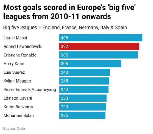 接下来是进球数据。自2010年以来,只有一名球员的进球数超过他:梅西。