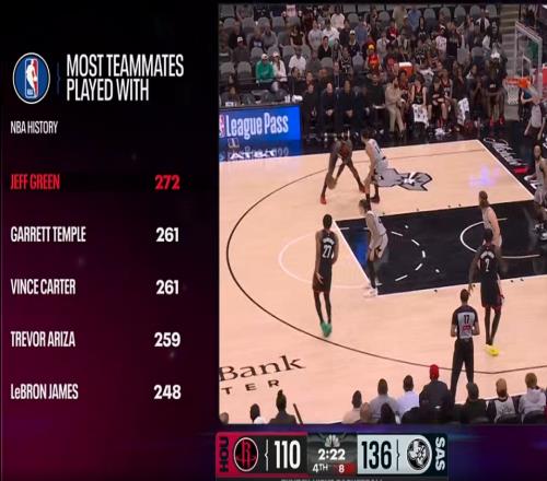 火箭老将杰夫·格林在联盟中与272人当过队友,NBA历史最多,前五如下: