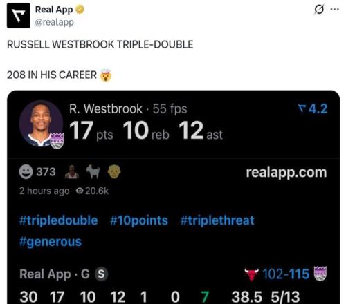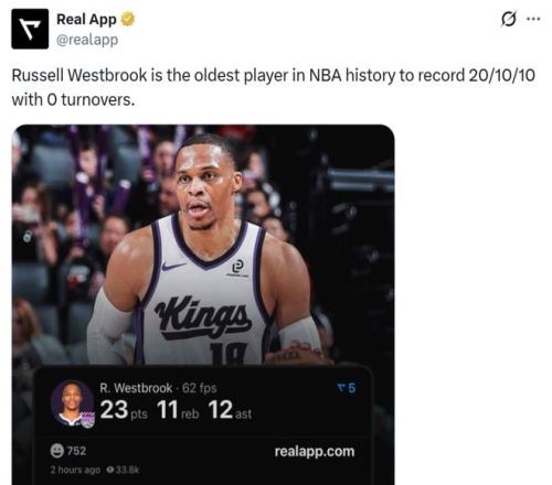 纪录一:37岁116天的威少打破马特-巴恩斯在36岁零2天时创造的纪录,成为NBA历史上单场交出至少20分10板10助0失误最老的球员;