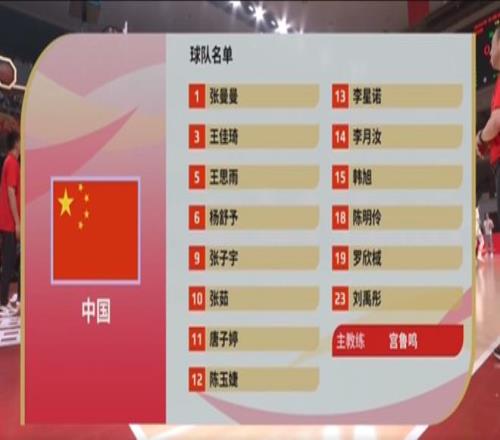中国女篮:唐子婷12分4板1助、刘禹彤11分4板、陈明伶10分4板、张子宇8分3板、张曼曼7分5板7助2断、杨舒予7分4板4助、王佳琦6分3板2助、罗欣棫6分3板3断、张茹5分6板3助、陈玉婕4分9板6助、韩旭4分2板、李星诺3分2板。