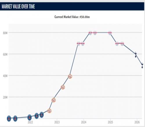 体育播报03月10日宣 德转3月9日更新英超球员身价,其中哈维·西蒙斯身价降至5000万欧。