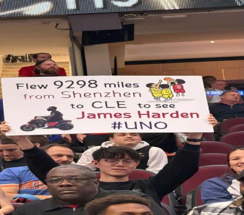 照片中,该球迷在观众席高举精心制作的应援牌,上面用英文写着:“从深圳飞行9298英里来到克利夫兰看詹姆斯-哈登”,并配有哈登骑电动车等经典元素的卡通图案。