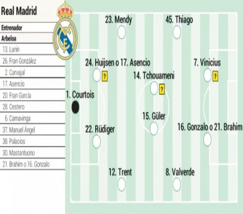 除了琼阿梅尼,罗德里戈、塞巴略斯和贝林厄姆都无法出场。此外,卡雷拉斯也无法上阵,巴尔韦德将出任中场而非右后卫。如果参考上次对阵曼城的阵容,阿韦洛亚可能会选择贡萨洛·加西亚(布拉欣·迪亚斯也是备选)和维尼修斯作为前锋组合。