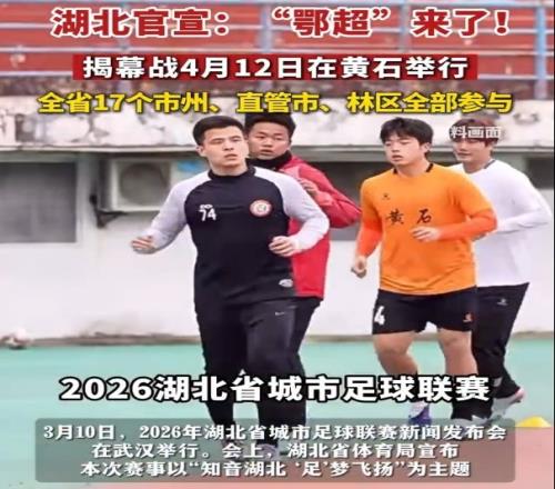 体育播报3月11日宣 据《湖北日报》报道,3月10日,2026年湖北省城市足球联赛新闻发布会在武汉举行。会上,湖北省体育局宣布,本次赛事以“知音湖北 ‘足’梦飞扬”为主题,赛期横跨4月至11月,全省17个市州、直管市、林区将全部参与。