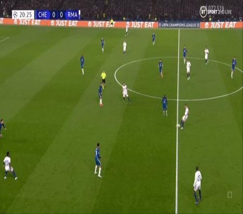 当维尼修斯能与队友配合并前插身后时,他在肋部区域就能构成威胁,就像下图中他在2021-22赛季四分之一决赛对阵切尔西时助攻本泽马那样。