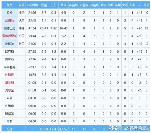 回顾整场比赛,阿德巴约犹如战神附体,出战长达42分钟之久。他一次次冲击篮筐,一次次在外线发炮,投篮43次命中20球,三分线外更是22投7中,展现出了全面的进攻手段。而在罚球线上,他更是稳如磐石,43次罚球命中36个,砍下了惊人的83分,同时还贡献了9个篮板、3次助攻、2次抢断和2次盖帽,正负值高达+21,堪称一人之力撑起了整支球队。