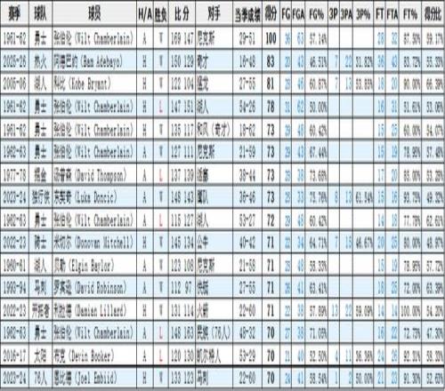 可以看到,除了张伯伦的78分、72分和70分,布克的70分,这四场的对手算是强队,其余高分的对手基本是弱队以及中下游球队,“在弱队身上刷分”这一点上,大家谁也别笑谁。而且,这也没有什么好说的,如果球员在一场比赛中状态爆棚,队友对手又成全,自己想刷刷记录,人之常情也。毕竟,不能期待人人都是伯德。