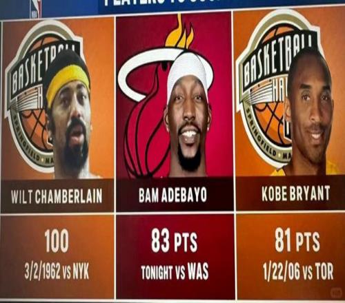 职业生涯至今,除了前两个新秀赛季,只要可以出战,阿德巴约都是热火队铁打的首发,场均可以砍下16分,生涯最高场均得分是2022-23赛季的20.4分。本赛季截至今天砍下83分以前,场均18.9分。据称阿德巴约此前生涯最高得分是41分,这个我暂时没办法核实。但可以肯定的是,他今天是第一次出现在个人单场50+得分榜上。