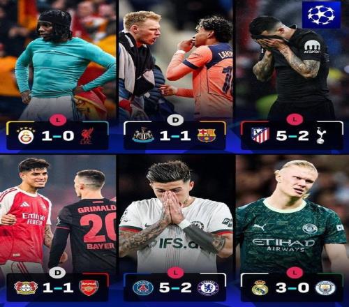 欧冠1/8决赛首回合,6支英超球队6场比赛,进6球失16球净胜球-10,诞生3场惨败多队濒临出局,创下自欧冠改制以来英超球队淘汰赛单轮最差战绩!