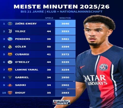 体育播报3月13日宣 德转统计本赛季五大联赛U21球员出场时间榜,巴黎球员埃梅里3646分钟第一,伊尔迪兹第二,亚马尔第七。