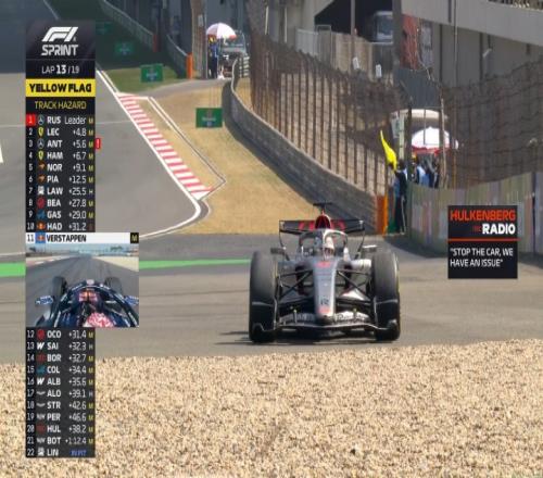 第13圈,霍肯伯格停在赛道旁,安全车出动,各队纷纷进站换胎!汉密尔顿因被迫跟在勒克莱尔身后而损失位置,诺里斯趁机升至第3。安东内利接受10秒罚时后退至第7。