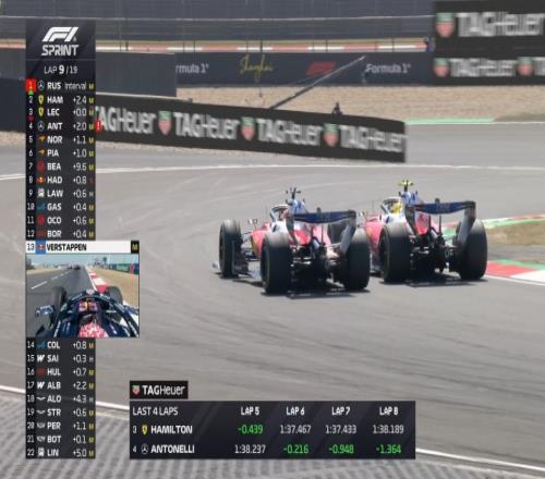 第11圈,安东内利在大直道上完成对汉密尔顿的超越,汉密尔顿掉到第4。与此同时,拉塞尔已将领先优势扩大至4秒。