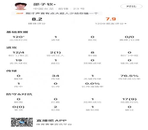 本场比赛邵子钦首发踢满全场,邵子钦本场比赛12次射门4次射正打进1球,8次偏出。创造1次机会,1次越位。
