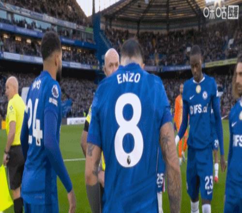 英超第30轮,切尔西vs纽卡,切尔西球员赛前围圈把主裁保罗·蒂尔尼围住,帕尔默抱裁判+盯着看。