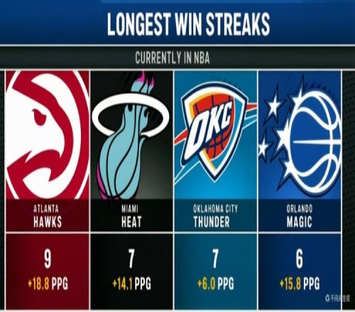 联盟目前最长连胜数:老鹰9连胜热火&雷霆7连胜魔术6连胜