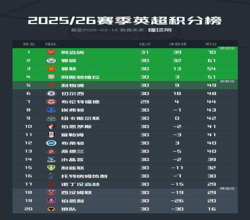 北京时间3月16日,英超联赛第30轮的10场比赛有9场已经结束,本轮领头羊阿森纳再度取胜,排名第二的曼城则在客场被西汉姆联逼平,曼联主场3-1拿下阿斯顿维拉,利物浦主场1-1战平近况不佳的托特纳姆热刺,切尔西则在主场0-1输给了纽卡斯尔联。